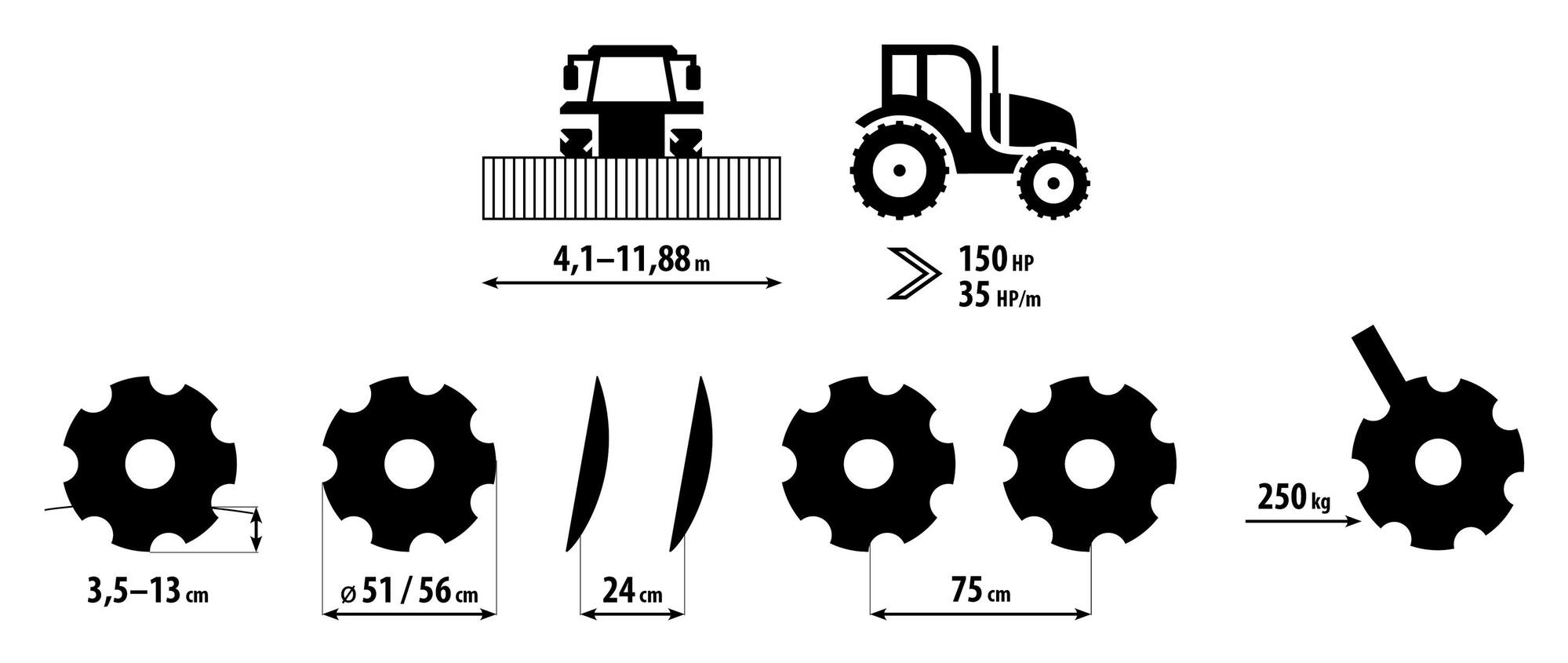 Дисковете с диаметър 510 мм / 560 мм се поставят в два реда. Всеки един от дисковете е вслучай при сблъскване с препятствието е самостоятелно защитен благодарение на каучуковото окачване.