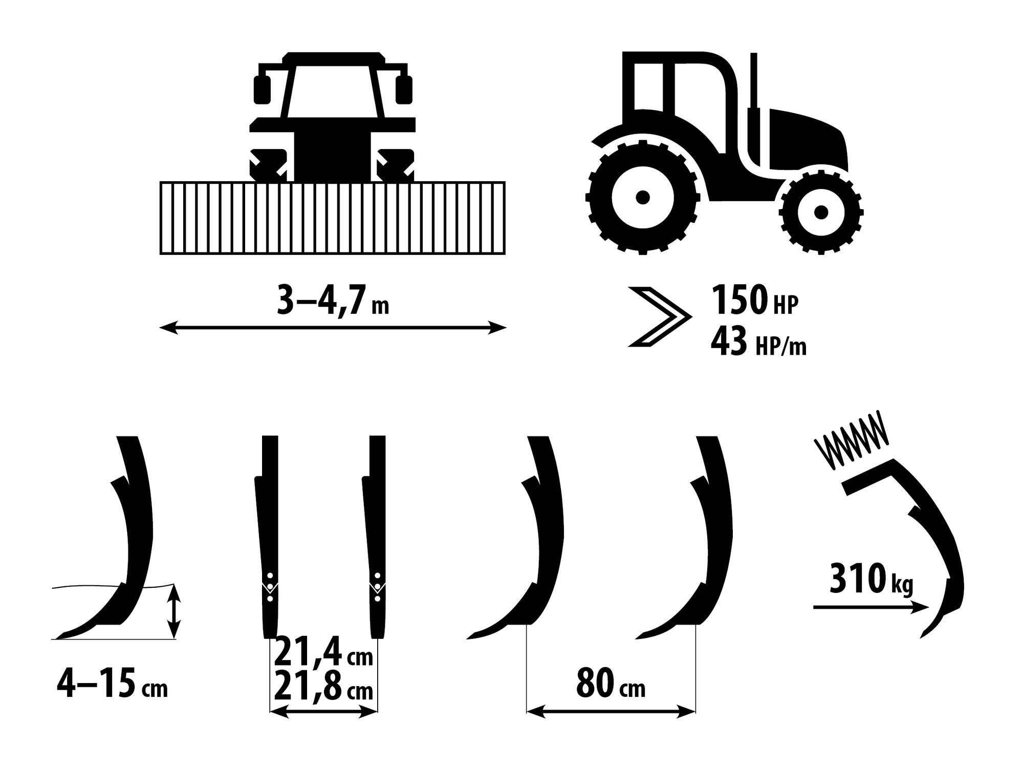1 Препоръчената необходима мощност, действителната сила на разтягането може значително да се мени в зависимост от дълбочината на обработката, почвените условия, наклона на терена, износването на работните органи и тяхната настройка.