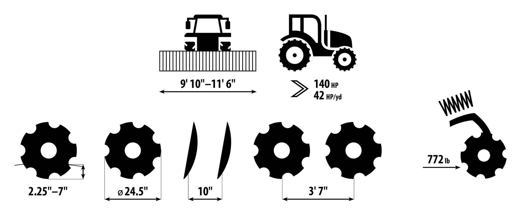 1. Disks with the diameter 24.5" arranged in two rows will undercut the ground. Working depth is 2.25"–7". There is a deflector behind each row of disks for crushing flying clods.