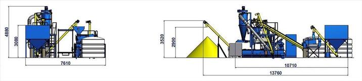 Se trata de la tecnología del prensado de dos grados con extrusión. Como prensa preliminar se usa la prensa de tornillo sinfín FS 350. Los productos prensados de la prensa preliminar caen a la tolva y entran en el extrudador FE 500, donde ocurre el proceso de la extrusión del material - su amasado mecánico, calentamiento a corto plazo a la alta temperatura bajo la presión alta, y expansión. El material extrudado pasa por un transportador inclinado al acabado de prensado en forma de la prensa FS 350.