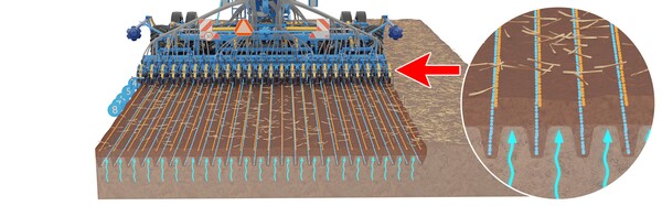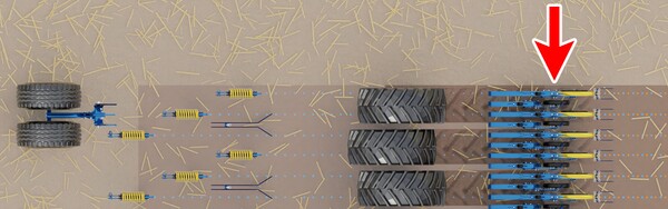 | 6 | Zona de creación de la cama de siembra y colocación de la simiente. Las rejas de siembra de dos discos crean la cama de siembra compacta (ranura V) y colocan precisamente la simiente en la profundidad requerida. Gracias a la alta presión adicional, a las rejas de siembra se puede transferir hasta el 70 % del peso de la máquina. La cama de siembra compacta y la ranura V aseguran el contacto perfecto de la simiente con el suelo y el agua en el suelo. |