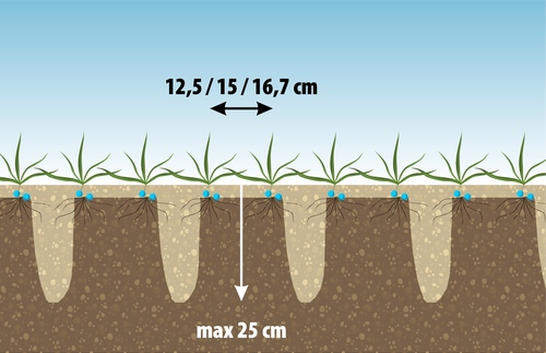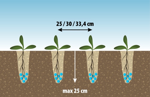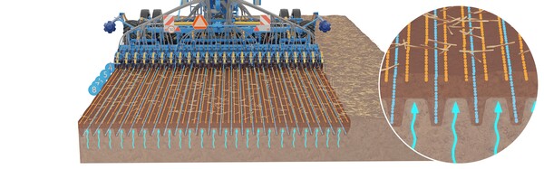 Cultivo en bandas con la posibilidad del abono adicional con abonos granulados hasta la profundidad de 250 mm.
