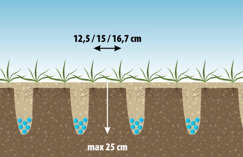 Para el abono con abonos granulados. Siempre entre cada 2 líneas de la planta. Siempre con el depósito de dos cámaras.