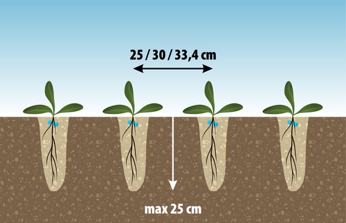 Distancia 250 / 300 / 334 mm – en combinación con la sección de cinceles en tres filas de tratamiento previo STRIP TILL es conveniente para el tratamiento del suelo en bandas, siembra con la posibilidad del abono adicional en una línea hasta la profundidad de 200 mm. Ideal para sembrar la colza de invierno.