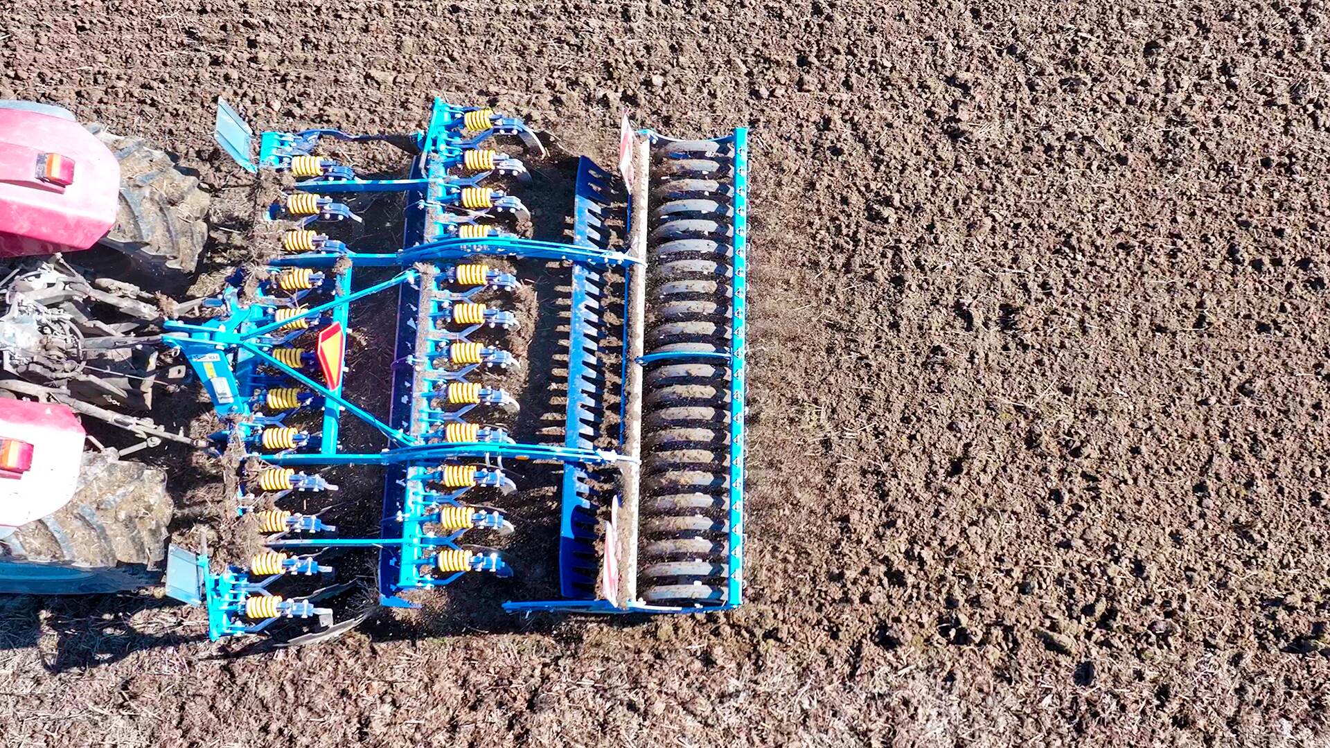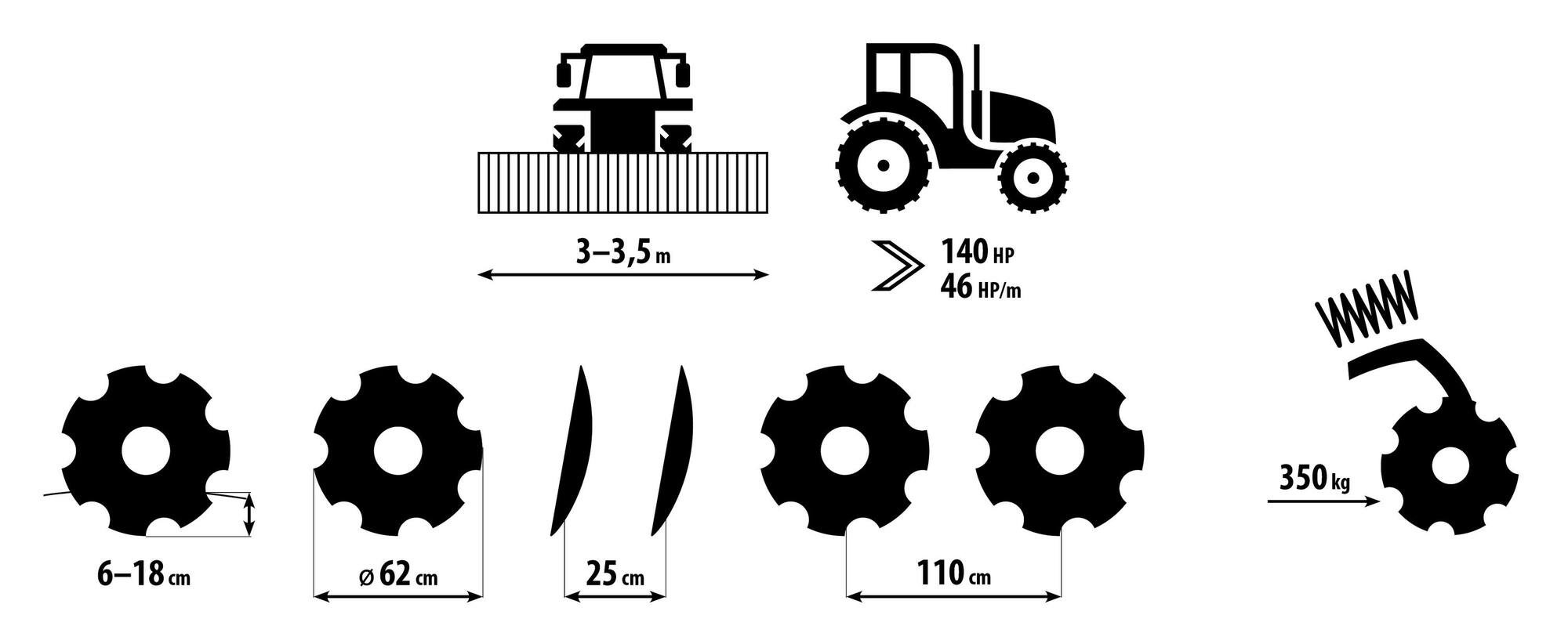 1 Pilnīga virsmas apstrāde. Diski izvietoti divās rindās, disku ģeometrija nodrošina ideālu augsnes apstrādi, augu atlieku sasmalcināšanu un iestrādi 6–18 cm dziļumā. Diski izlīdzina augu atliekas vienmērīgi visā agregāta platumā.