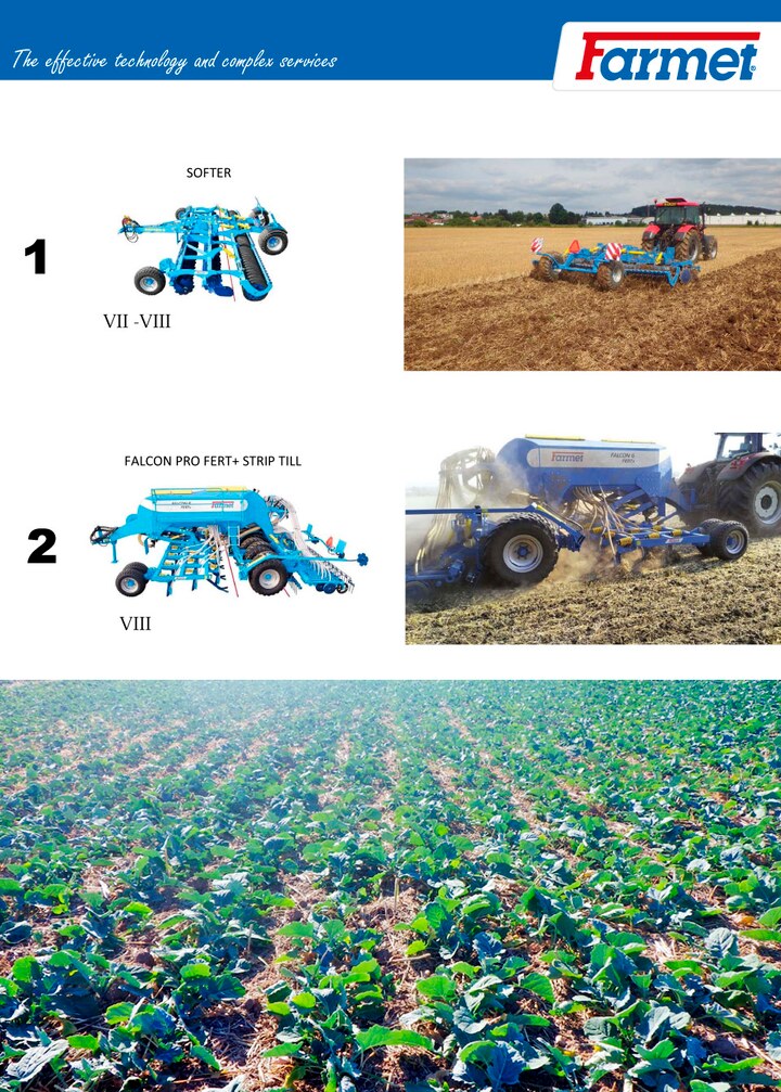 Ze względu na niepewne opady i znacznie suche lata wyraźnym trendem jest zakładanie uprawy rzepaku ozimego połączone w jedną operację z pasowym spulchnianiem. Zarówno bezpośrednio do ścierniska, jak i do płytkiej podorywki. Do tych technologii przeznaczony jest modułowy siewnik Falcon PRO w konfiguracji z dłutową sekcją strip i redlicami siewnymi do rzędów o rozstawie 25 cm. Maszyna wyposażona jest w dłuta spulchniające, które zapewniają spulchnienie gleby w osiach rzędów do głębokości aż 20 cm. Dłuta o szerokości tylko 20 mm zapewniają spulchnienie bez ryzyka tworzenia się grud i z bardzo niskim oporem. Przede wszystkim na suchych obszarach system ten przynosi wyrównane uprawy i jest podstawą doskonałych plonów. Wilgotność gleby jest maksymalnie wykorzystana na rzecz rzepaku a cały proces zakładania uprawy jest bardzo produktywny. Spulchnianie gleby w trakcie siewu może być połączone z umieszczaniem nawozu bezpośrednio do strefy korzeniowej przyszłych roślin. Standardem w wielu gospodarstwach jest siew do płytkiej podorywki, która często odbywa się natychmiast za kombajnem. Brony talerzowe Softer doskonale podcinają i wmieszają resztki roślinne i tworzą warstwę delikatnej spulchnionej ziemi, która na ciężkich glebach poprawia późniejszy kontakt nasion z glebą po siewie strip.