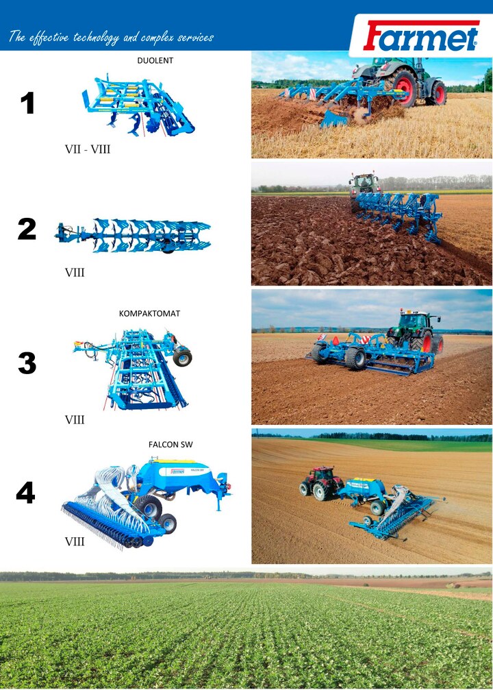 Классической, в настоящее время сдающей свои позиции, является технология с пахотой. И здесь необходимо качественное лущение, предпочтительно на большую глубину, для того чтобы хорошо перемешать растительные остатки по широкому горизонту. Помимо ускорения разложения органического вещества и подавления нежелательных эффектов, ограничивающих растению доступ к влаге в почве, хорошее лущение повышает качество измельчения при пахоте. Далее необходимо снова качественно сделать вспаханную почву компактной с применением комбинации Kompaktomat. Передние и задние катки машины снова эффективно утрамбуют почву, восстановят почвенную капиллярность и создадут оптимальное посевное ложе. Рыхлящие секции взрыхлят поверхностный слой почвы и создадут лёгкую «перину» для предотвращения испарения, а также оптимальные условия для всходов. Для высева в подготовленную таким образом почву оптимально подходит, например, сеялка с большой шириной обработки Falcon SW. Промежуток времени между пахотой, предпосевной подготовкой и высевом должен быть как можно меньше, идеально до 1-2 часов.