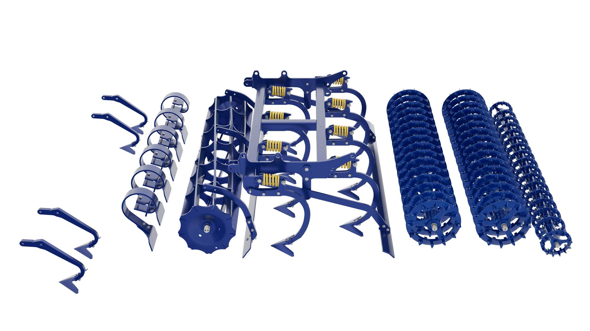 Универсальная культивационная секция оснащена стреловидными лемехами шириной 27 см, расположенными в два ряда. Сошники установлены на салазках с геометрией, улучшающей прохождение растительных остатков. Поэтому данная сошниковая секция подходит для участков с большим количеством измельченных растительных остатков и для тяжёлых почв. В стандартной комплектации за рабочими стойками установлена регулируемая по высоте выравнивающая волокуша.