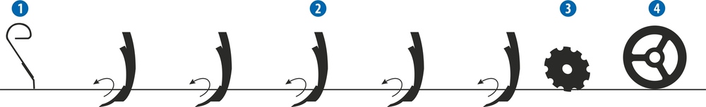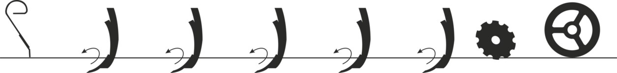 | 2 | Зона рыхления. Глубина рыхления 4-15 см. Долота для рыхления с оптимизированной геометрией, расположенные в трёх рядах обеспечивают отличное рыхлениение и интенсивное перемешивание почвы с растительными остатками. |