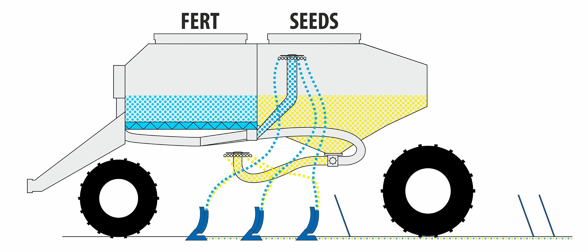 | 2 | Посев семян и внесение удобрений за одну операцию. Семена и удобрения вносят специальными анкерными сошниками. Сошники обеспечат создание посевного ложа и посев семян в широкие полосы с междурядьем около 12 см. В то же время они вносят гранулированные удобрения в корневую зону будущих растений между двумя полосами семян. |